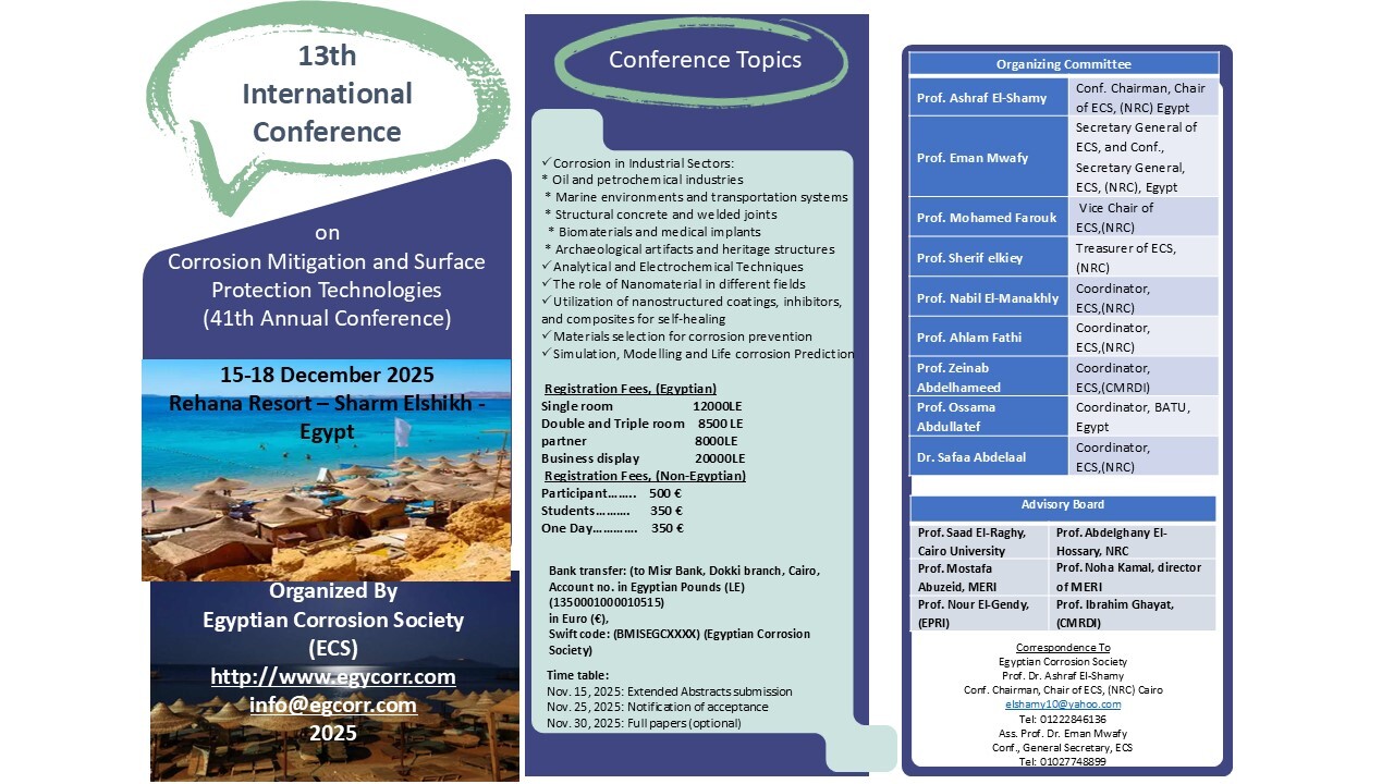 تتقدم الجمعية المصرية لتآكل الفلزات وحمايتها بخالص الشكر والتقدير لكل الجامعات والمراكز البحثية والشركات التى أبدت الرعاية والدعم والتعاون والمشاركة بمؤتمر الجمعية ونخص بالذكر كل من