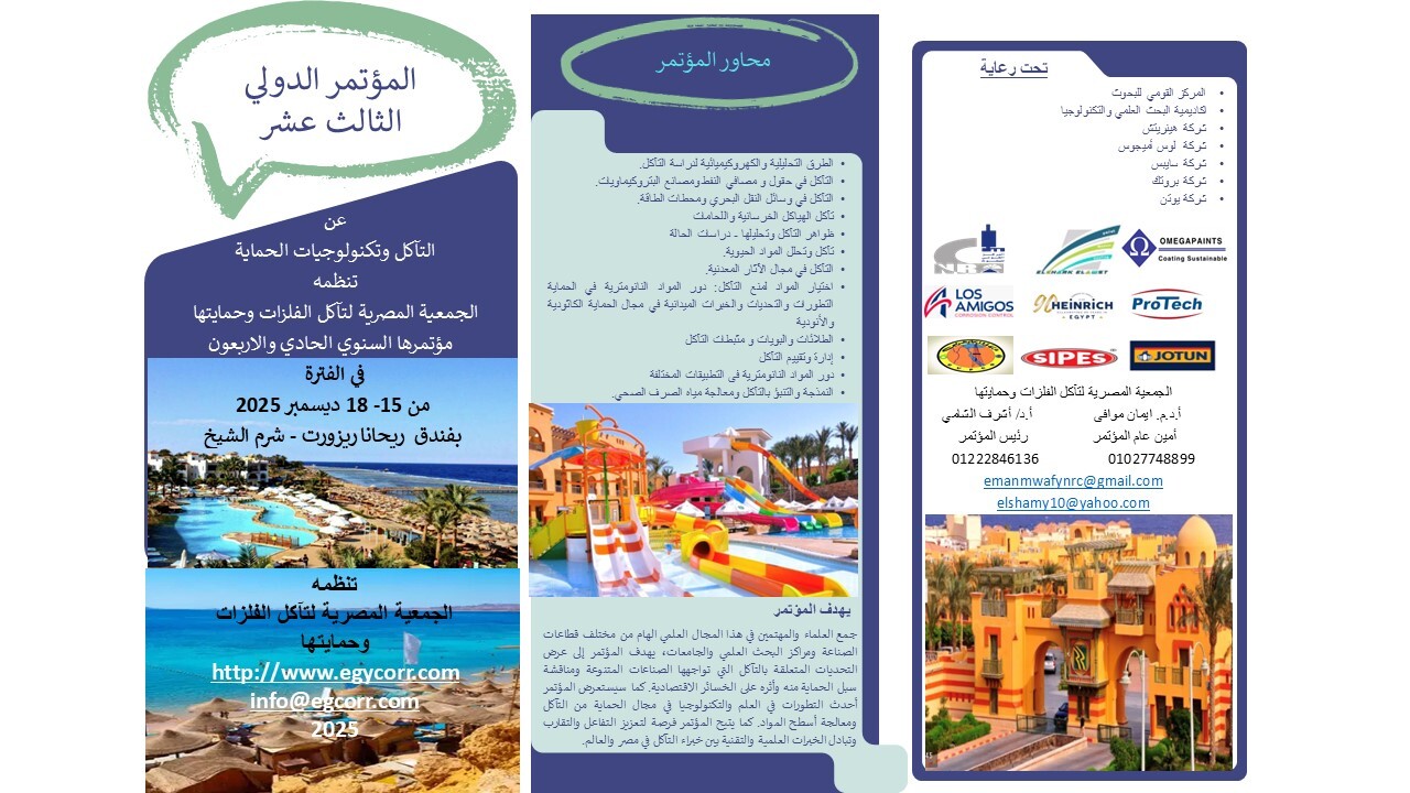 تتقدم الجمعية المصرية لتآكل الفلزات وحمايتها بخالص الشكر والتقدير لكل الجامعات والمراكز البحثية والشركات التى أبدت الرعاية والدعم والتعاون والمشاركة بمؤتمر الجمعية ونخص بالذكر كل من